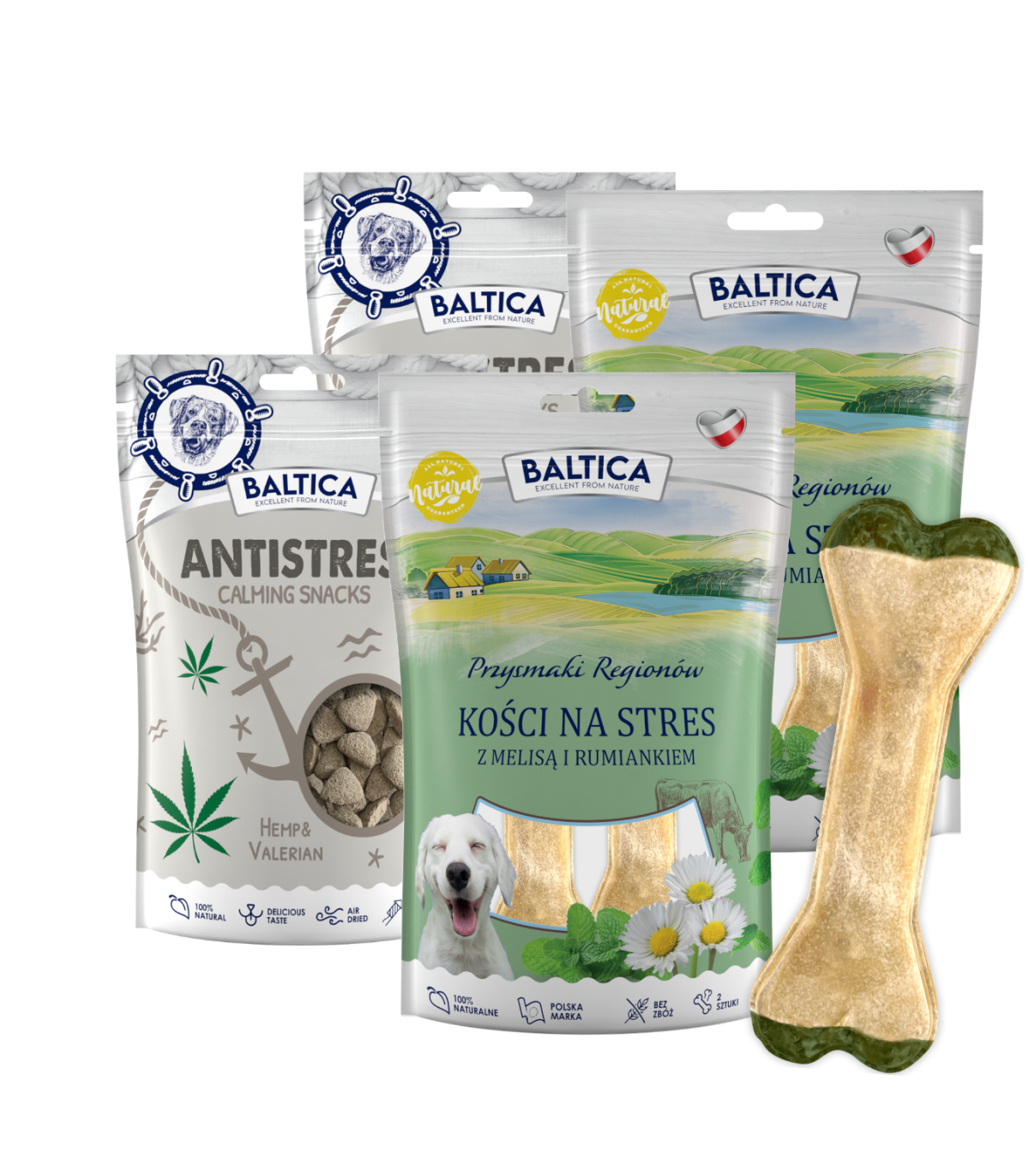 Zestaw kości i przysmaków przeciwstresowych dla psa. Bogate w składniki o działaniu uspokajającym i relaksującym.