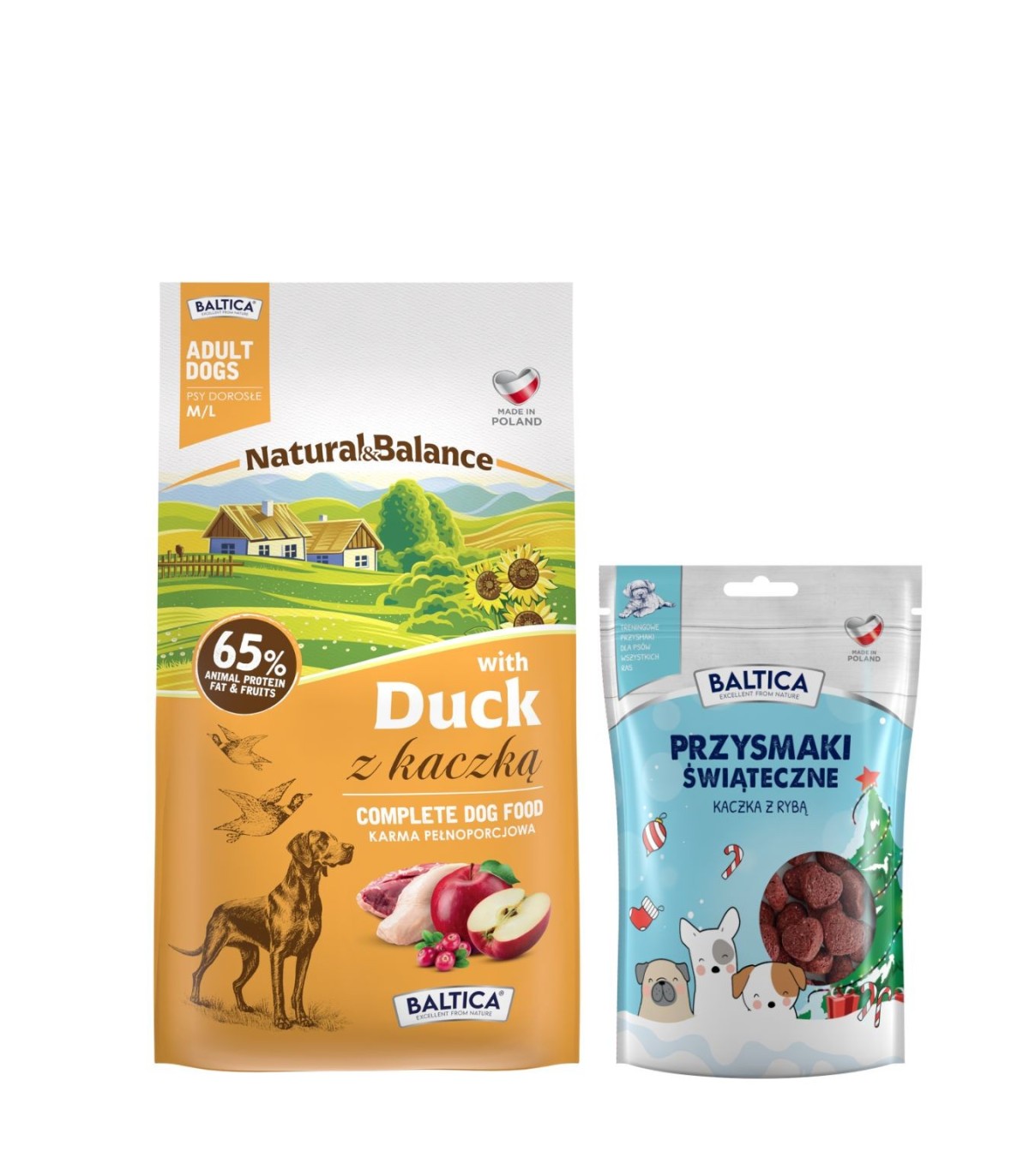 Kaczka dla ras średnich i dużych karma 3kg - Baltica Natural & Balance + Przysmaki świąteczne 100g