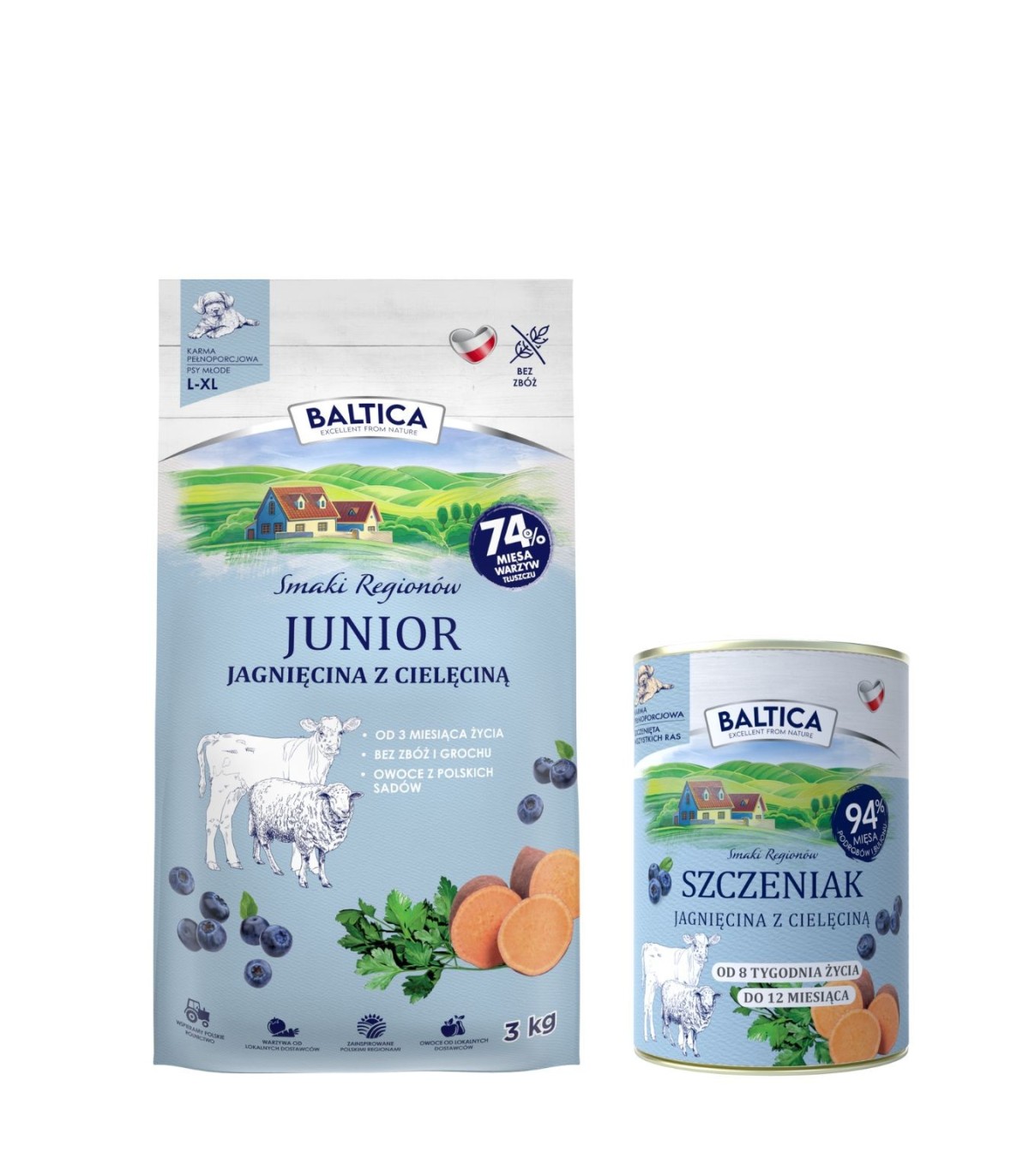 Jagnięcina z cielęciną dla szczeniąt ras dużych i olbrzymich karma 3kg - Baltica Smaki Regionów + karma mokra dla psa 400g