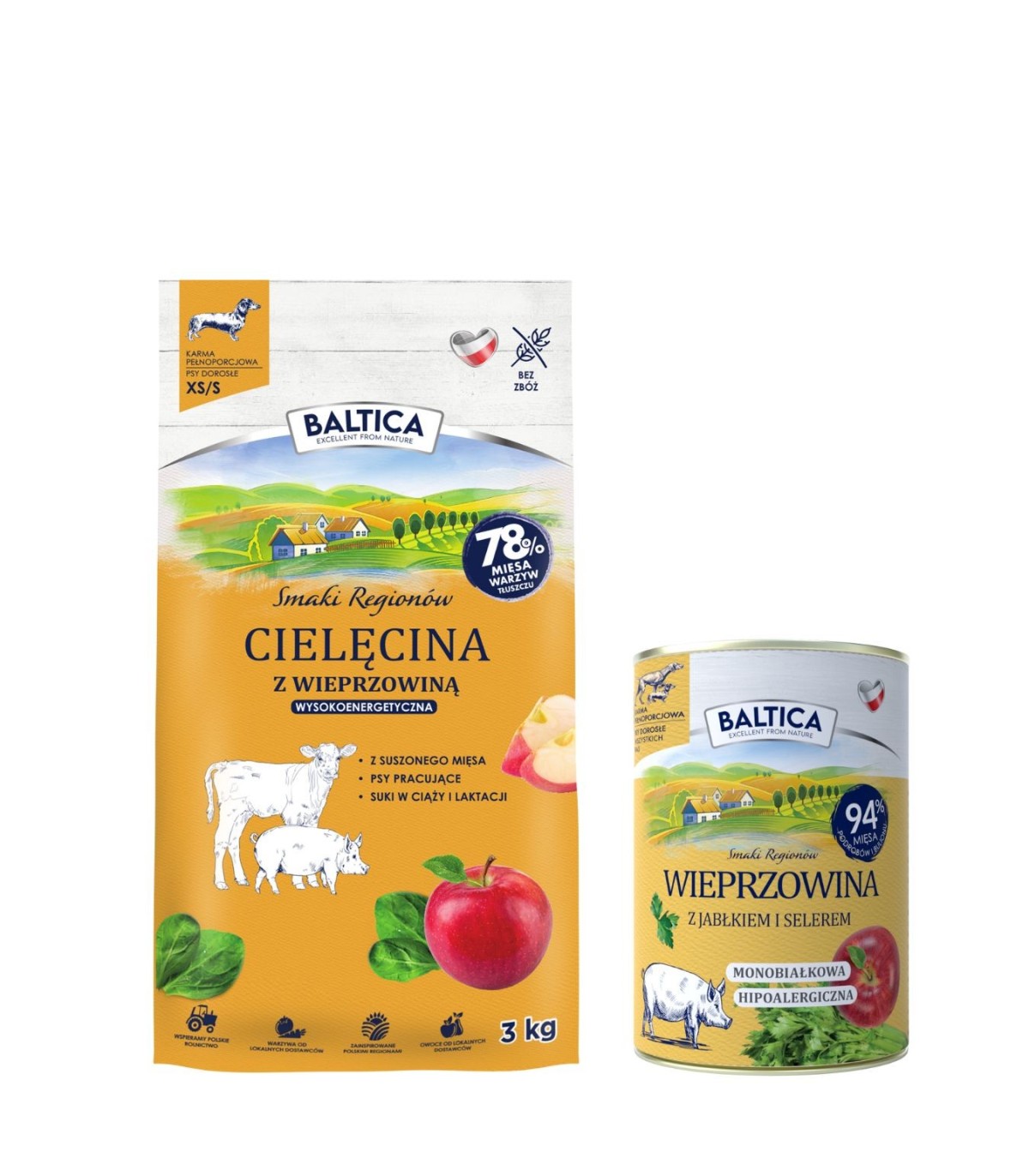 Cielęcina z wieprzowiną dla ras małych i miniaturowych karma 3kg - Baltica Smaki Regionów + karma mokra dla psa 400g