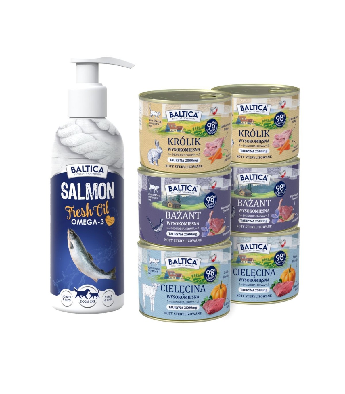 Zestaw 6x 185g karma dla kotów dorosłych MIX 1 + olej z łososia 200ml