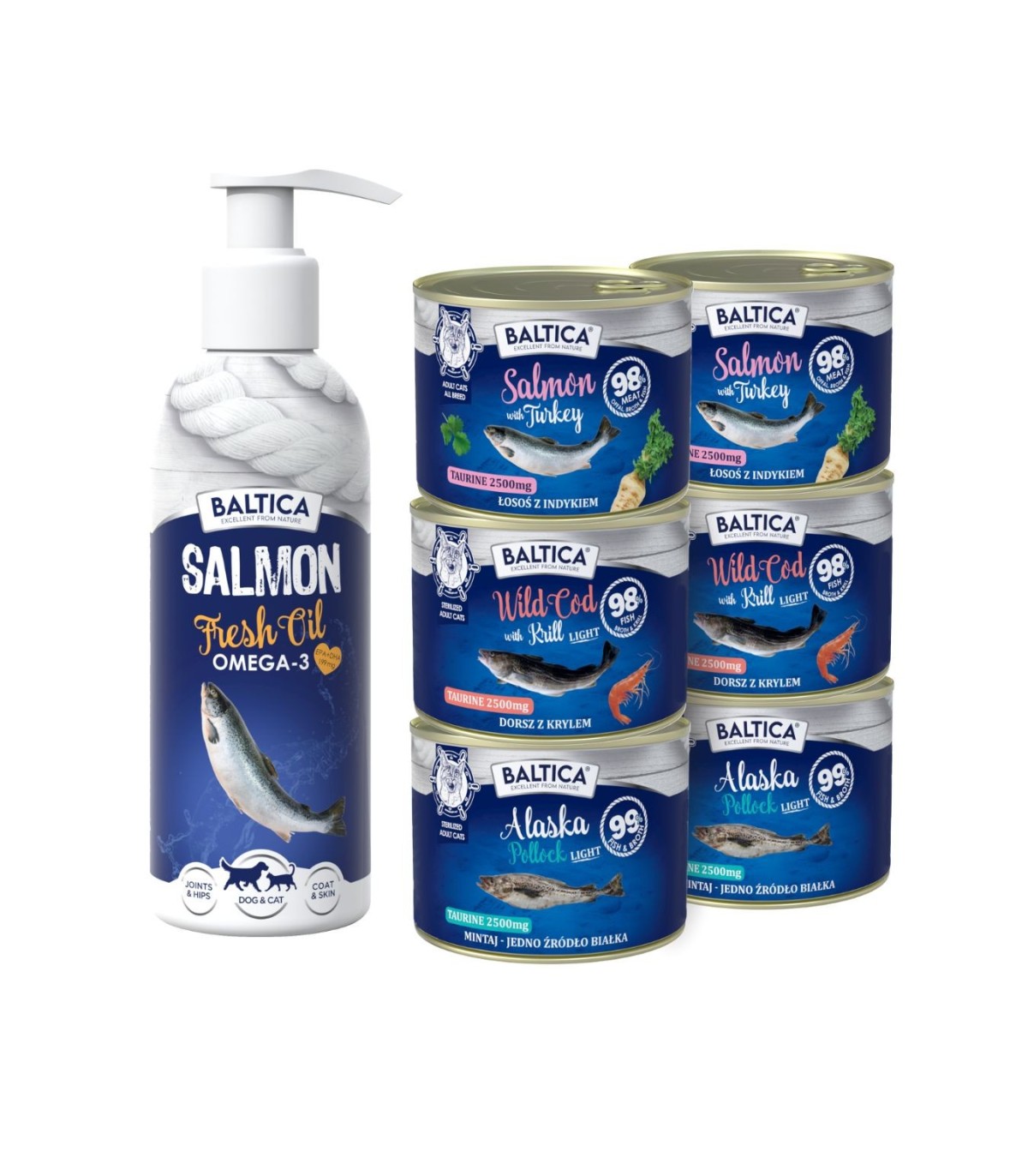 Zestaw 6x 185g karma dla kotów dorosłych MIX 2 + olej z łososia 200ml