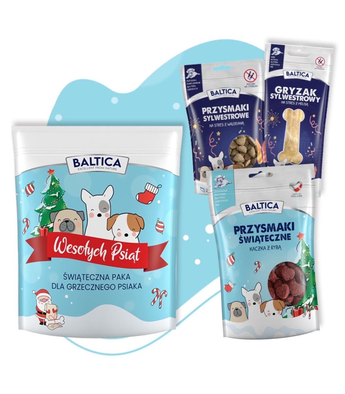 Święta to prezentów czas, nie zapomnij o milusińskich! Podaruj swojemu psiakowi świąteczny zestaw zawierający Przysmaki Sylwestrowe na stres, jedną kość na stres, doskonałą na podanie podczas Sylwestrowej nocy oraz przysmaki z kaczką i rybą w świątecznym opakowaniu.