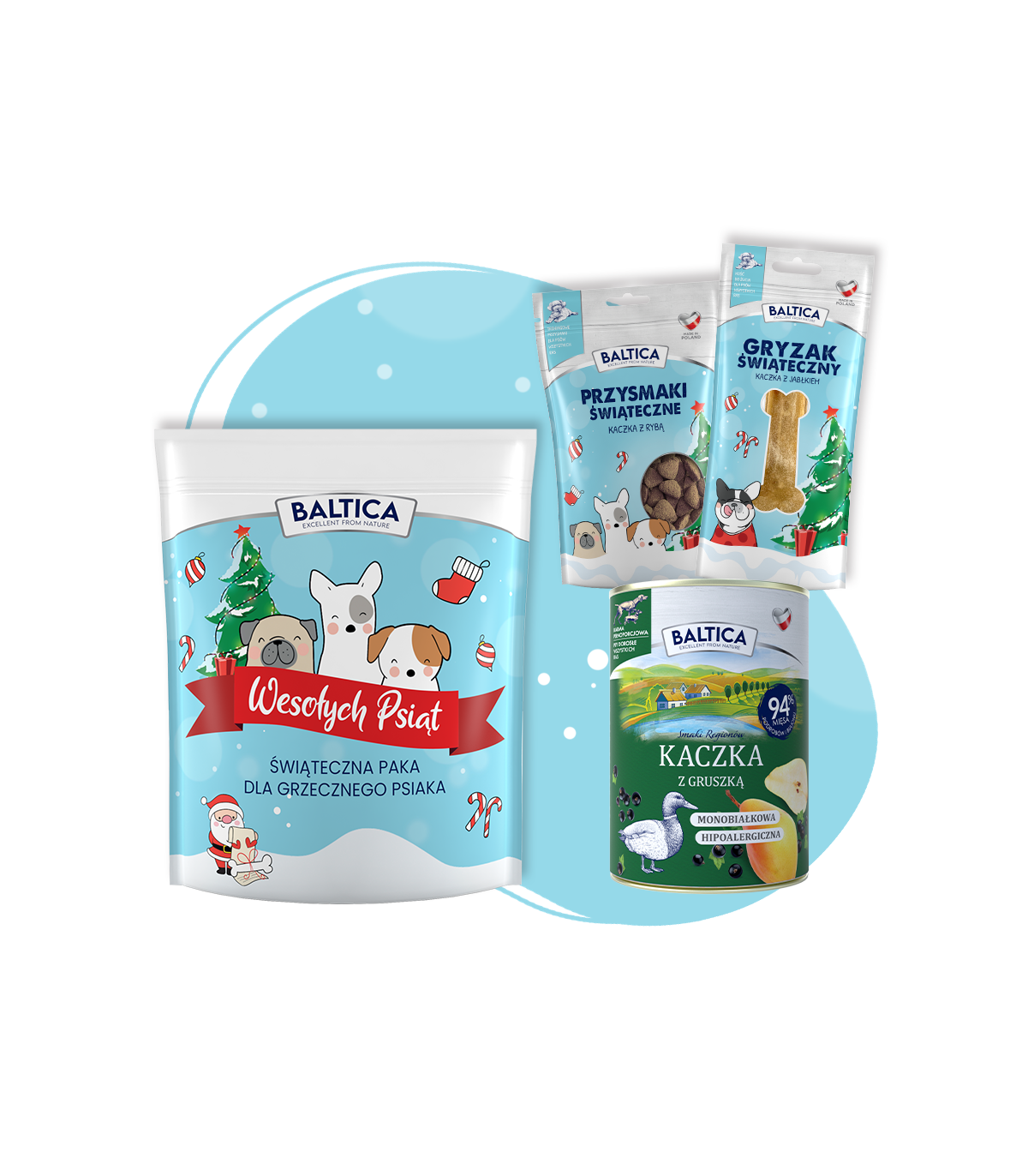 Święta to prezentów czas, nie zapomnij o milusińskich! Podaruj swojemu psiakowi świąteczny zestaw zawierający Przysmaki świąteczne z kaczką i rybą, jedną kość kaczka z jabłkiem w świątecznym opakowaniu oraz monobiałkową karmę mokrą z kaczką i gruszką.